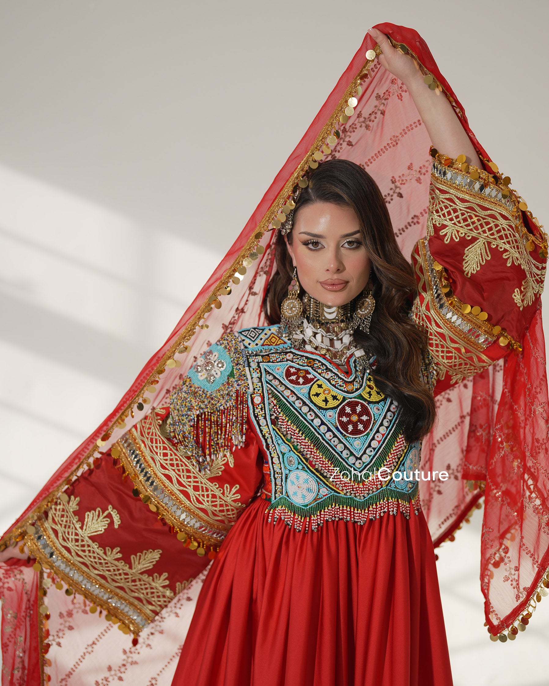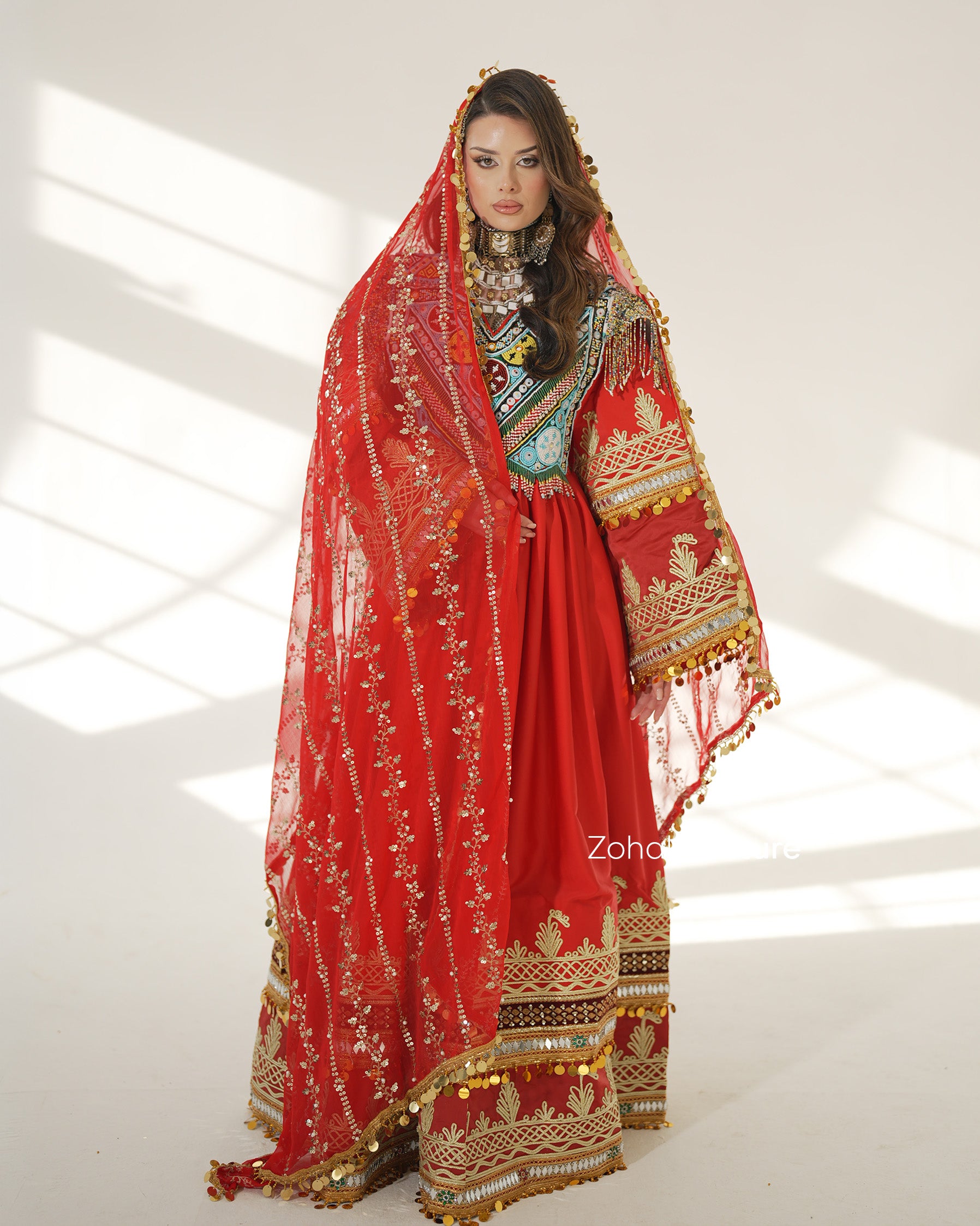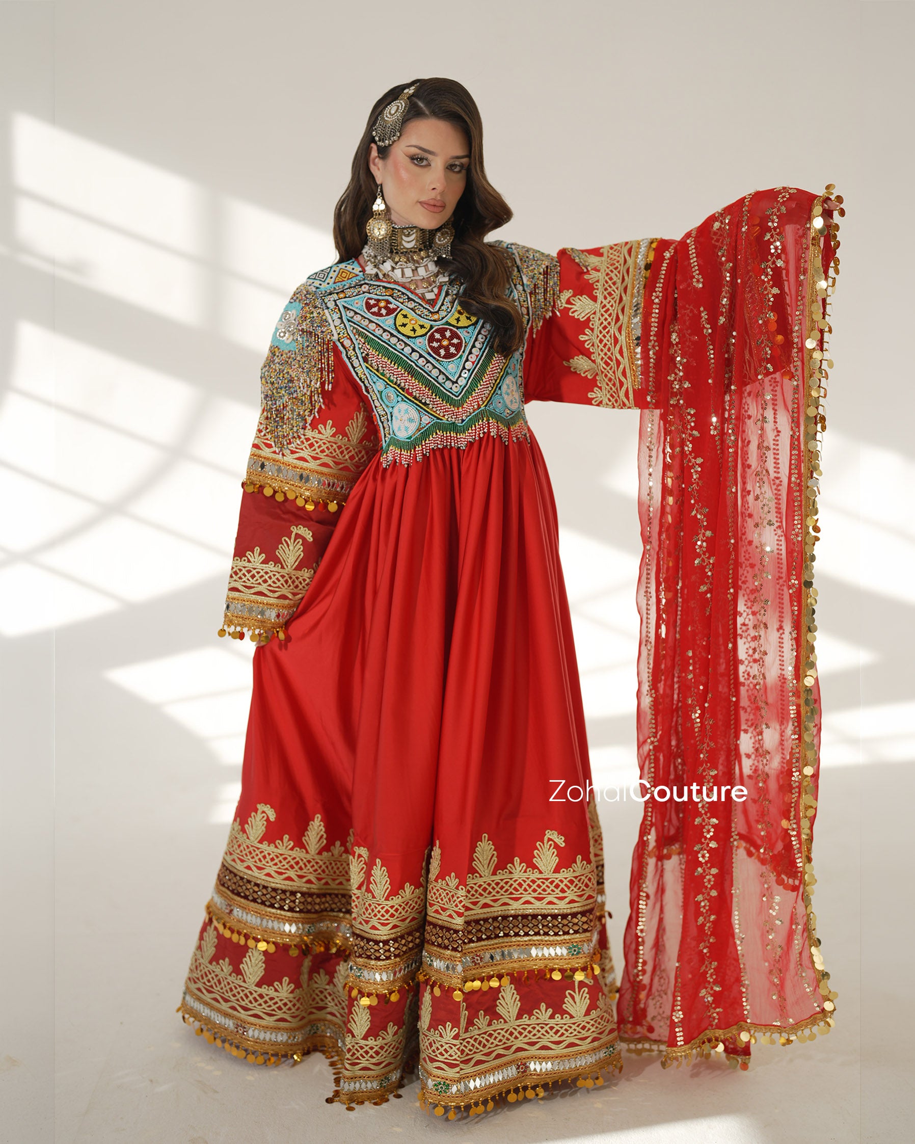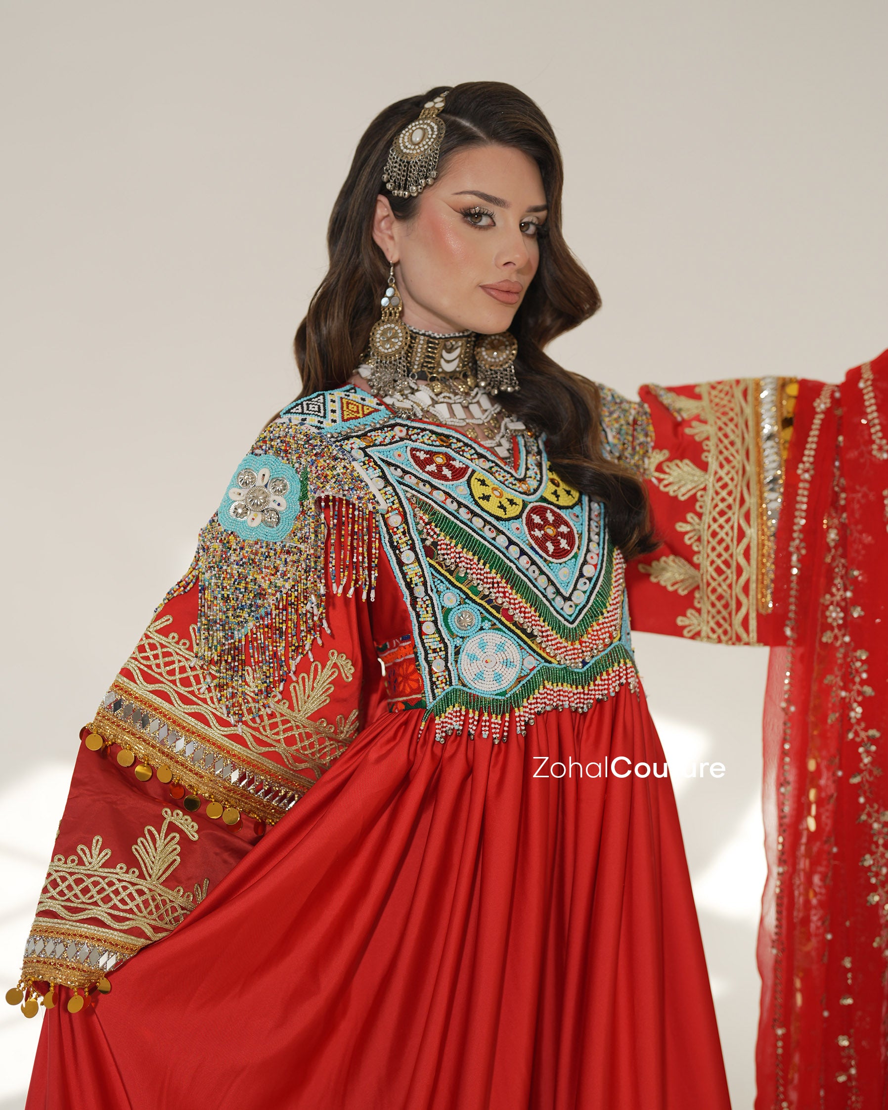 Ein Meisterwerk von ZOHAL Couture, das afghanisches Erbe mit königlicher Weiblichkeit verbindet. Mit auffälligen Stickereien, luxuriösen Stoffen und sorgfältiger Verarbeitung verkörpert dieses Design afghanische Eleganz.