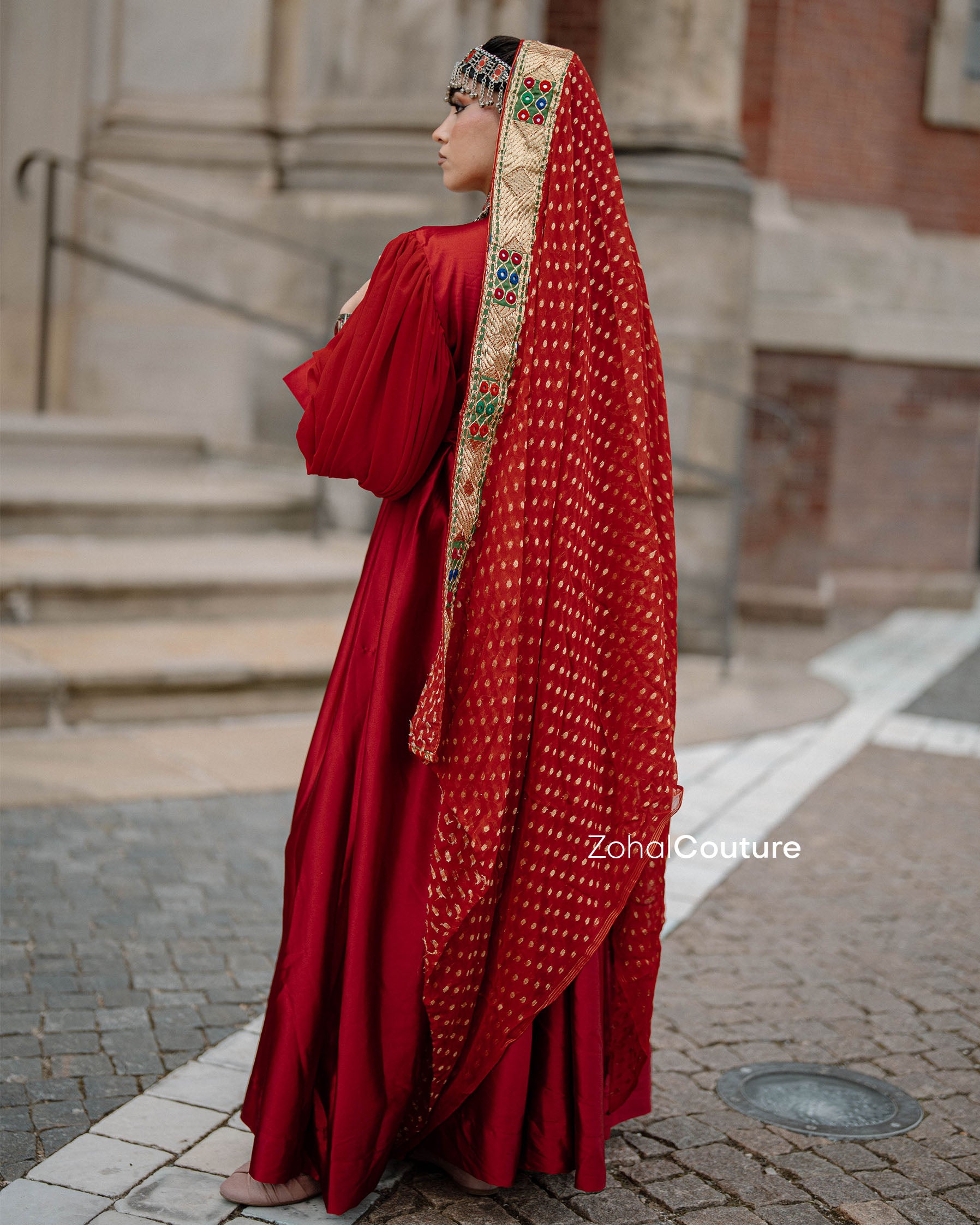 A stunning creation by ZOHAL Couture, the Turquoise Serenity dress combines Afghan tradition with modern elegance. Featuring a vibrant turquoise satin fabric with golden motifs, intricate beadwork, and flowing sleeves, this dress exudes timeless beauty.